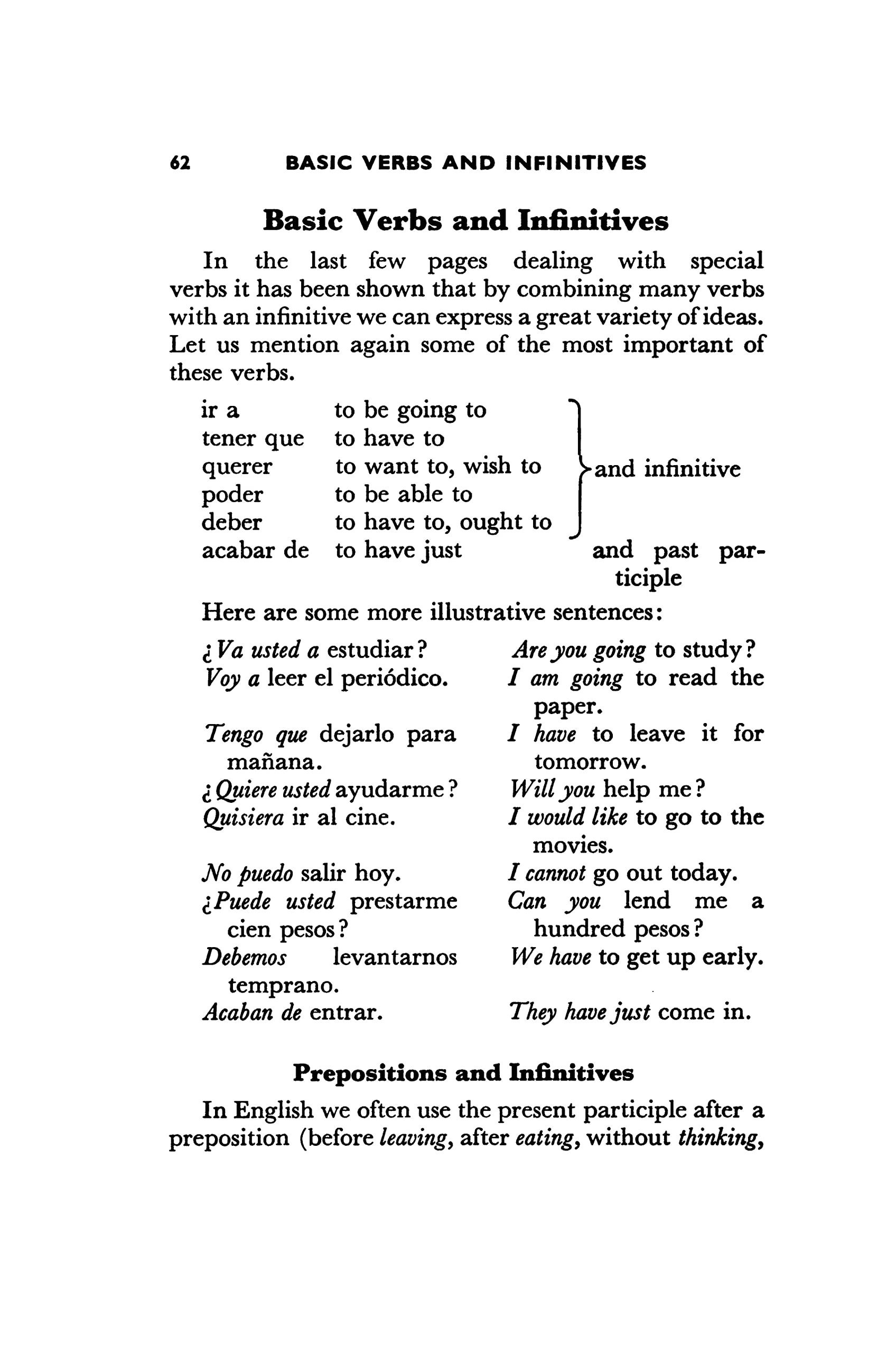 All the major aspects of Spanish grammar are presented in logical order: vocabulary and vocabulary building; word order; how to turn a positive sentence into a negative one; how to form questions; nouns; pronouns; adjectives; adverbs; how to conjugate verbs in the major tenses; how to use auxiliary verbs; prepositions and infinitives; useful expressions; and vocabulary tips. A glossary is devoted to the definition of all grammatical terms used throughout the book.