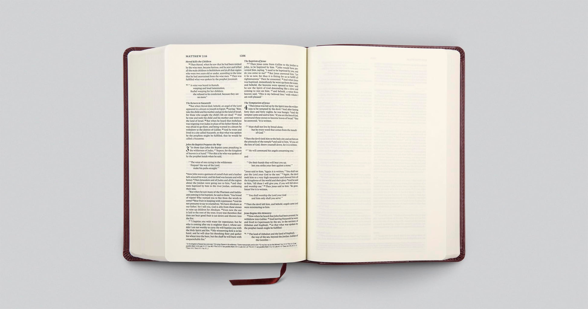 Details: Patterned after the Bible that Jonathan Edwards, the 18th-century preacher and theologian, used to record more than 5,000 notes about God’s Word, the ESV Journaling Bible, Interleaved Edition features a full, blank page next to every page of 7.5-point Bible text. Created for Bible readers looking for as much space as possible for sermon notes, personal reflections, prayers, or artwork, this edition features cream-colored paper and a durable binding to ensure that it lasts a lifetime. Personal Bible Study Tool: Includes a one-year reading plan and a full, blank page for notes, reflections, and prayers next to every page of Bible text High-Quality Production: Features cream-colored paper, a ribbon marker, and smyth-sewn binding