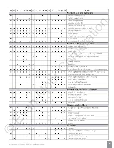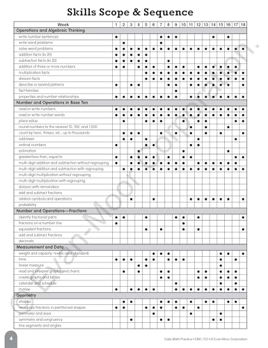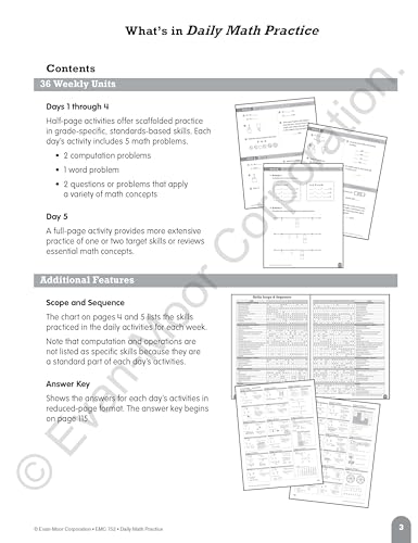 Details: Evan-Moor Daily Math Practice Book for grade 3 helps to keep skills sharp with focused practice presented in standardized testing formats. Book of 112 pages comes with 36-week progressive program along with scope, sequence charts and answer keys. The book covers the subjects of computation, number, patterns, geometry, measurement, and data.