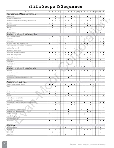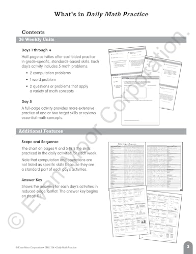 Details: Evan-Moor Daily Math Practice Book for grade 5 helps to keep skills sharp with focused practice presented in standardized testing formats. Book of 112 pages comes with 36-week progressive program along with scope, sequence charts and answer keys.