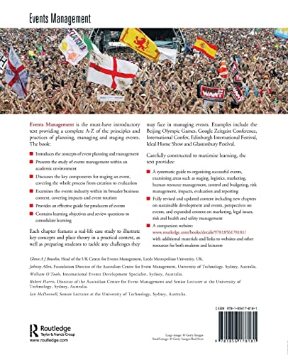 Each chapter features a real-life case study to illustrate key concepts and place theory in a practical context, as well as preparing students to tackle any challenges they may face in managing events. Examples include the Beijing Olympic Games, Google Zeitgeist Conference, International Confex, Edinburgh International Festival, Ideal Home Show and Glastonbury Festival. Carefully constructed to maximise learning, the text provides the reader with: