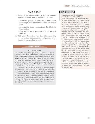 Experiencing Dance engages students in learning with a mixture of movement and written, oral, and multimedia assignments. Each of the text’s 15 chapters offers at least three lessons, each containing the following sections: Move It! introduces students to the lesson through a movement experience; the web resource supplements some activities with video examples. Vocabulary provides definitions of key terms. Curtain Up offers relevant background information. Take the Stage presents dance-related assignments for students to produce and share. Take a Bow gauges students understanding of the assignment. Spotlight introduces a person, thing, event, or place aligned with the topic. Did You Know? offers additional information to enhance overall knowledge. The web resource contains extended learning activities, worksheets, handouts, and additional resources. With tools that fully immerse students in the world of dance, Experiencing Dance is the ideal textbook to help students develop interactive dance portfolios and gain perspective of dance as an art form.