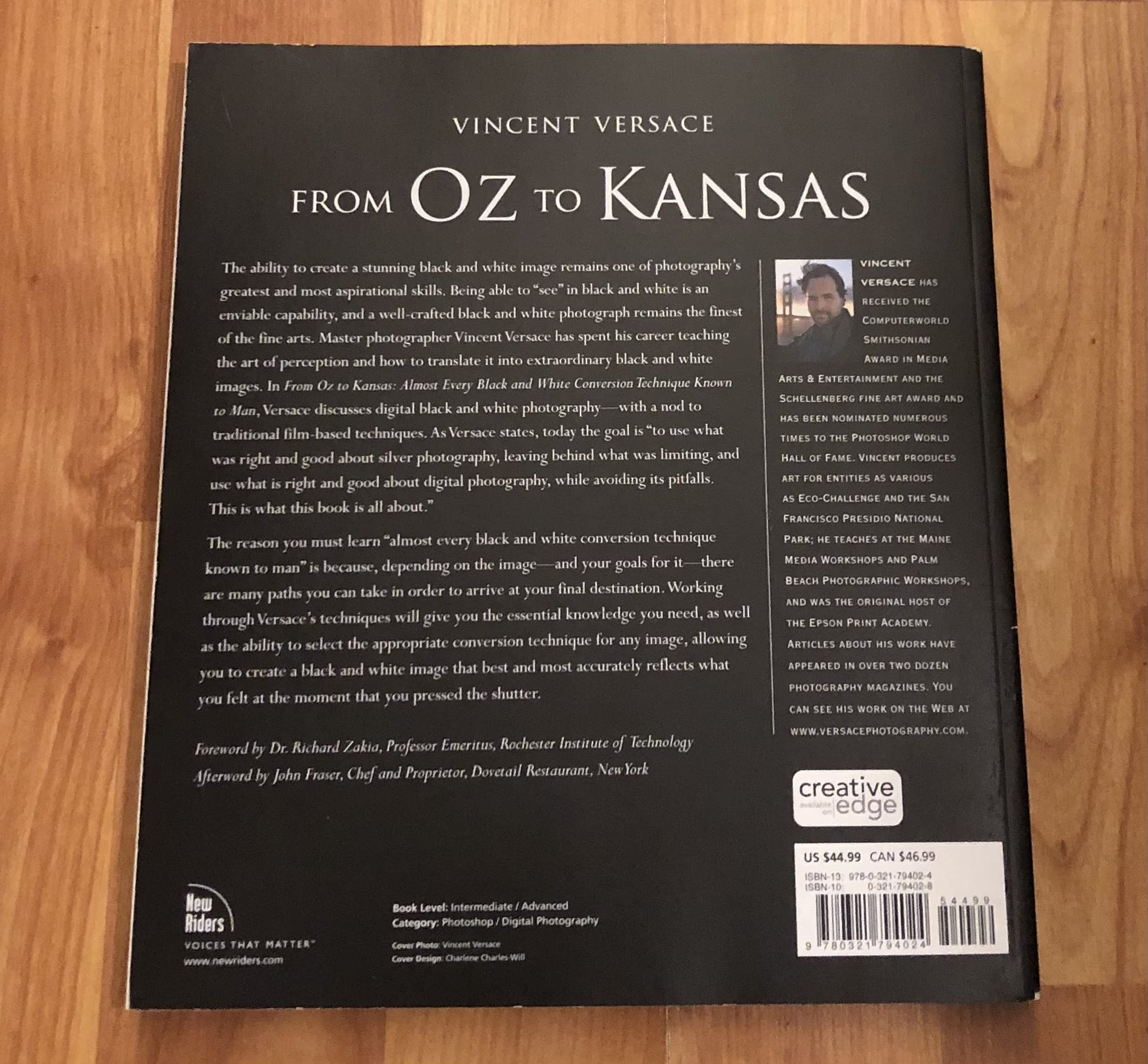 In From Oz to Kansas: Almost Every Black and White Conversion Technique Known to Man, Versace discusses digital black and white photography–with a nod to traditional film-based techniques. As Versace states, today the goal is "to use what was right and good about silver photography, leaving behind what was limiting, and use what is right and good about digital photography, while avoiding its pitfalls. This is what this book is all about."