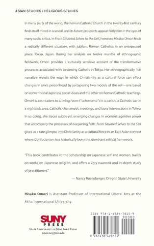 In many parts of the world, the Roman Catholic Church in the twenty-first century finds itself mired in scandal, and its future prospects appear fairly dim in the eyes of many social critics. In From Situated Selves to the Self, however, Hisako Omori finds a radically different situation, with jubilant Roman Catholics in an unexpected place: Tokyo, Japan. Based on twelve months of ethnographic fieldwork, the author provides a culturally sensitive account of the transformative processes associated with becoming Catholic in Tokyo. Her ethnographically rich narrative reveals the ways in which Christianity as a cultural force can effect changes in one's personhood by juxtaposing two models of the self-one based on conventional Japanese social ideals and the other on Roman Catholic teachings. Omori takes readers to a living room ("ochanoma") in a parish, a Catholic bar in a nightclub area, Catholic charismatic meetings, and busy intersections in Tokyo. In so doing, she traces subtle yet emerging changes in women's agentive power that accompany the processes of deepening faith. From Situated Selves to the Self gives us a rare glimpse into Christianity as a cultural force in an East Asian context where Confucianism has historically been the dominant ethical framework.
