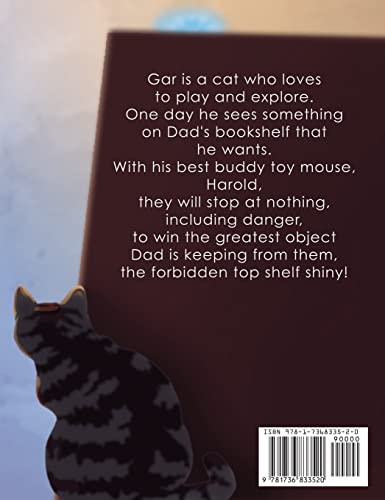 Details: Gar is a cat who loves to play and explore. One day he sees something on Dad's bookshelf that he wants. With his best buddy, his toy mouse, Harold, they will stop at nothing, including danger, to win the greatest object Dad is keeping from them, the forbidden top shelf shiny.