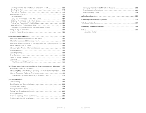 In Getting Started with Arduino, you will learn about: Interaction design and physical computing The Arduino board and its software environment Basics of electricity and electronics Prototyping on a solderless breadboard Drawing a schematic diagram Using the Cloud IDE and the new Arduino IoT Cloud Building a custom plant-watering system Making a WiFi-enabled internet fistbump Written by Massimo Banzi, the co-founder of Arduino and Michael Shiloh, Arduino educational lead.