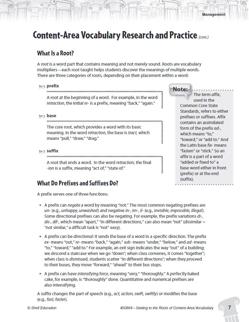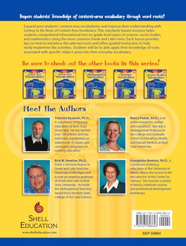 Details: Expand your students' content-area vocabulary and improve their understanding with this roots-based approach! This standards-based resource, geared towards fourth grade, helps students comprehend informational text on grade-level topics in science, social studies, and mathematics using the most common Greek and Latin roots. Each lesson provides tips on how to introduce the selected roots and offers guided instruction to help easily implement the activities. Students will be able to apply their knowledge of roots associated with specific subject areas into their everyday vocabulary.