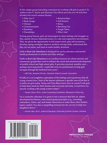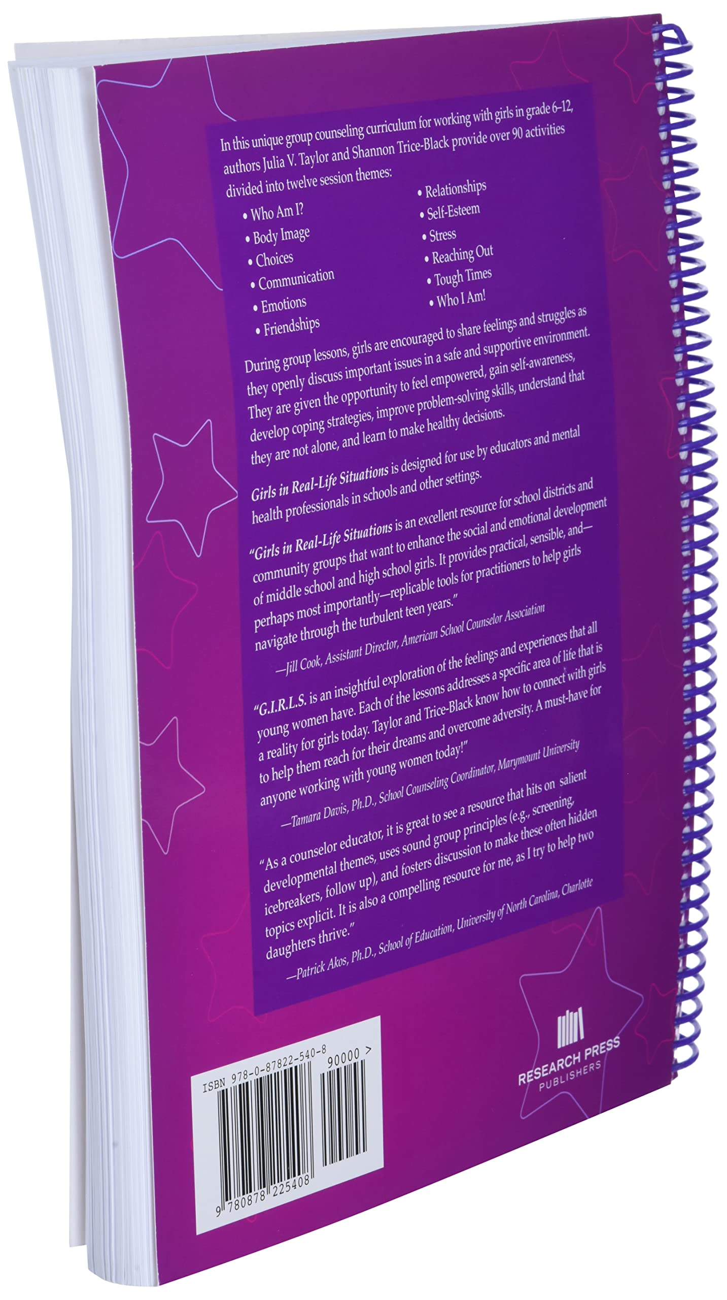Details: "In this unique group counseling curriculum for working with girls in grade 6-12, authors Julia V. Taylor and Shannon Trice-Black provide over 90 activities divided into twelve group themes: Who am I?, Body image, Choices, Communication, Emotions, Friendships, Relationships, Self-esteem, Stress, Reaching out, Tough times, Who I am! During group lessons, girls are encouraged to share feelings and struggles as they openly discuss important issues in a safe and supportive environment. They are given the opportunity to feel empowered, gain self-awareness, develop coping strategies, improve problem-solving skills, understand that they are not alone, and learn to make healthy decisions. Girls in real life situations is designed for use by educators and mental health professionals in schools and other settings"--[p.4 Cover].