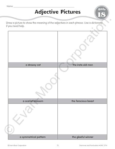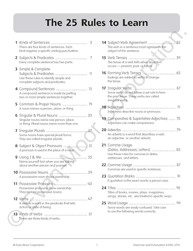 Details: Evan-Moor Grammar & Punctuation Book designed for grade 4 offers 25 rule charts plus three activity sheets per rule. Book includes CD-ROM with review test and answer key. Book also features student record sheet, a reproducible student rule book and consists of 112 pages.