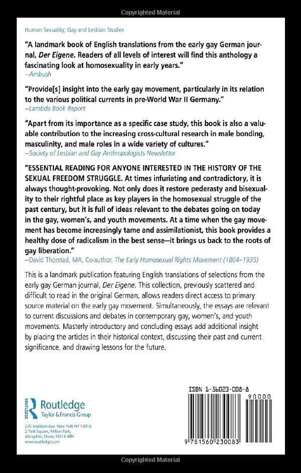 Details: This is a landmark publication featuring English translations of selections from the early gay German journal, Der Eigene. This collection, previously scattered and difficult to read in the original German, allows readers direct access to primary source material on the early gay movement. Simultaneously, the essays are relevant to current discussions and debates in contemporary gay, women's, and youth movements. Masterly introductory and concluding essays add additional insight by placing the articles in their historical context, discussing their past and current significance, and drawing lessons for the future.