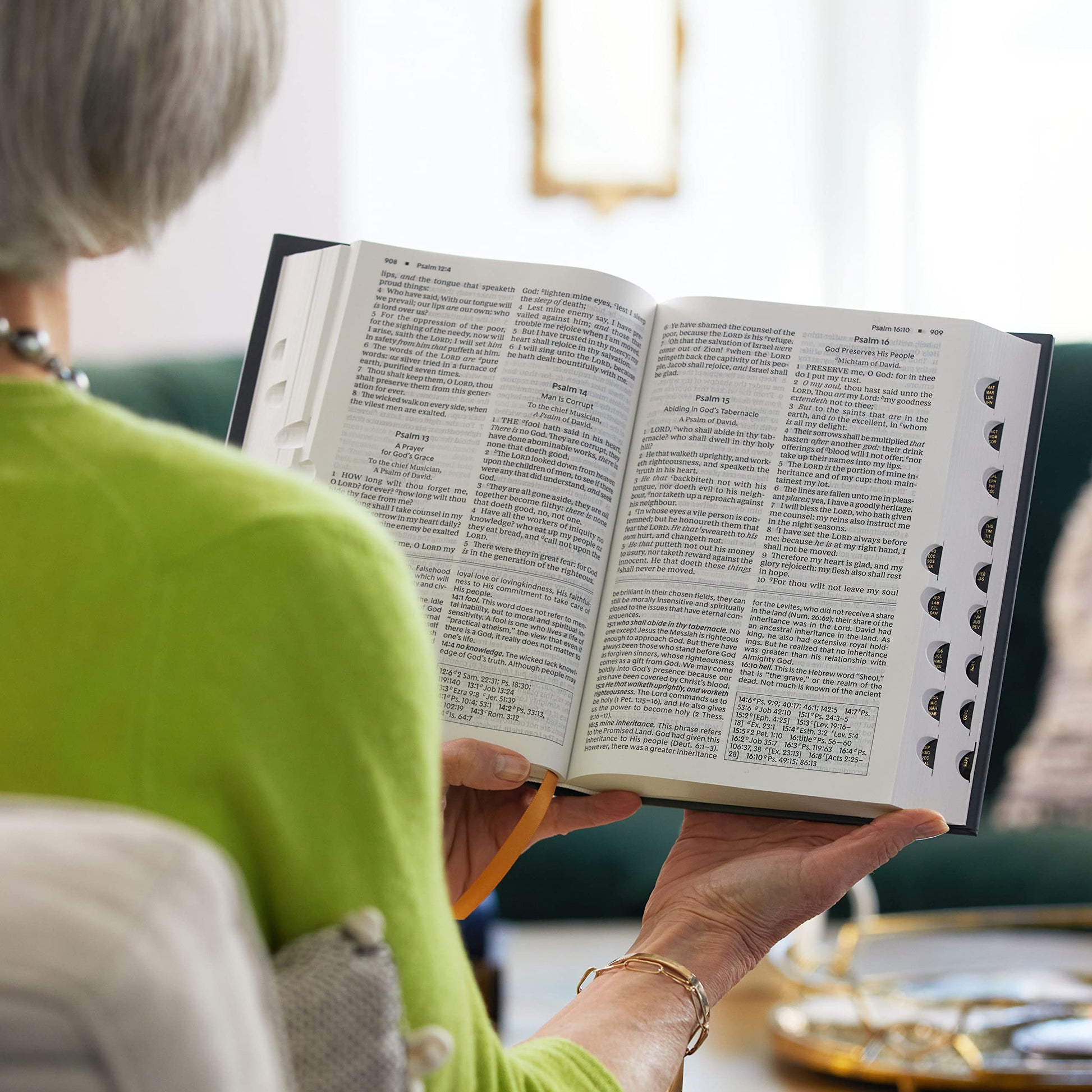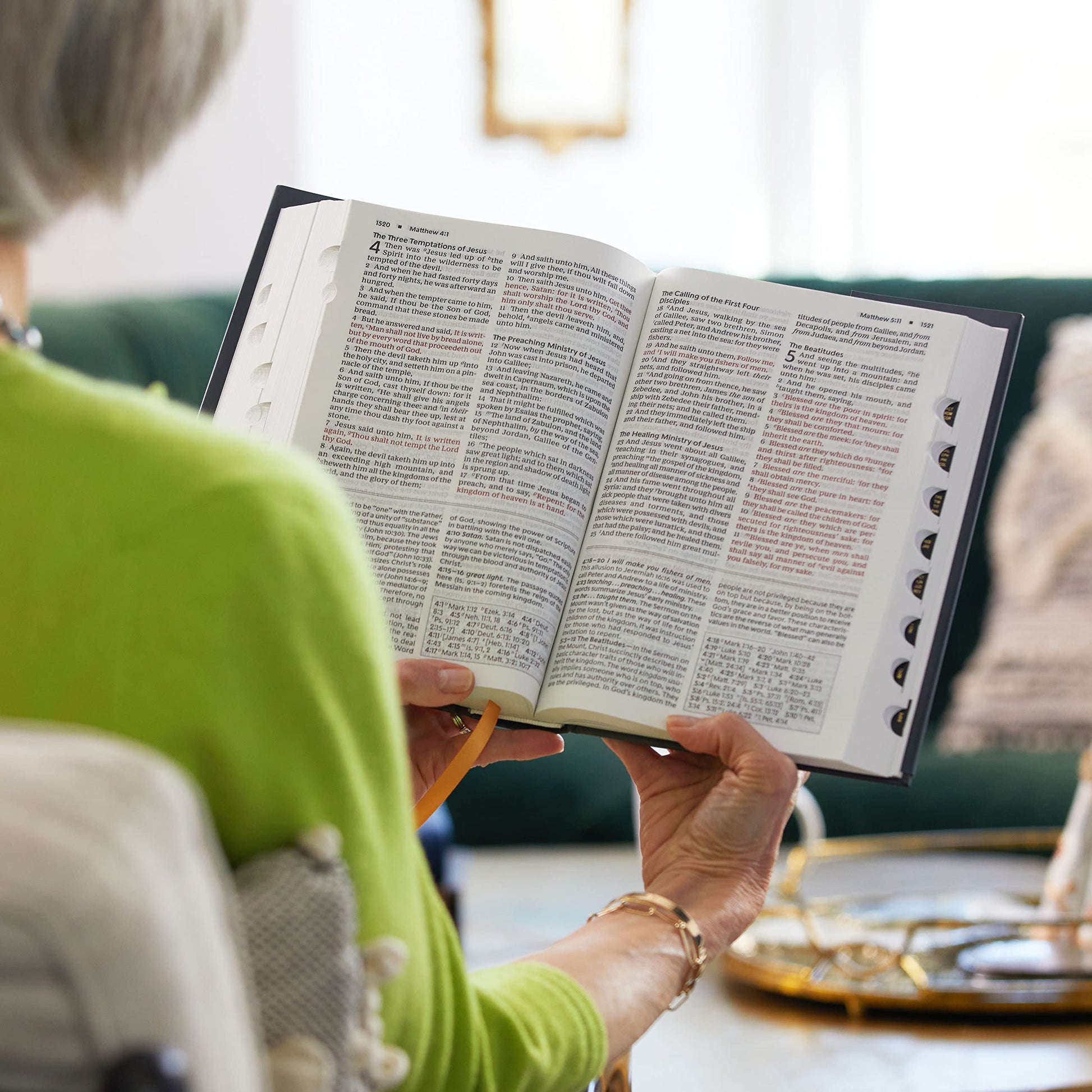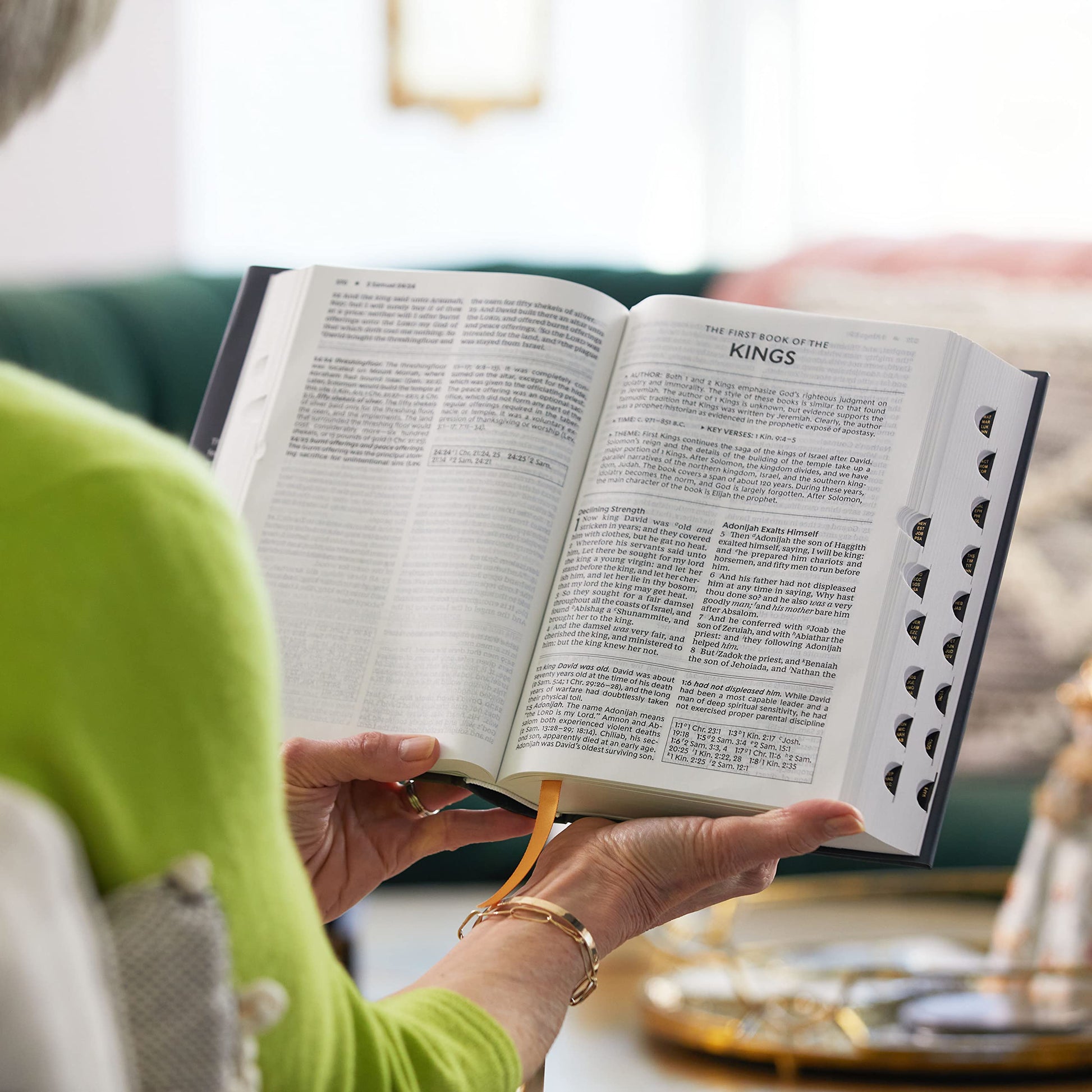 Features include: The Presentation page is a special place to personalize this special gift by recording a memory or note Bible book introductions provide a concise overview of the background and historical context of the book about to be read Over 32,000 End-of-page cross references allow you to find related passages quickly and easily Concise study notes with over 293,000 words provide helpful comments on passages of Scripture Over 300 theological notes and index draw attention to important doctrinal themes Ribbon markers make it easy to navigate and keep track of where you were reading Extensive study aids: Prayers of the Bible of nearly 100 prayers in the Bible, who prayed them, and what they prayed about. Prophecies of The Messiah Fulfilled in Christ provides 43 Old Testament prophecies and where they have been fulfilled in the New Testament. Harmony of the Gospels details the life and ministry of Jesus in chronological order showing where each event and teaching occur in the Gospels. Miracles of Christ shows where you can find 37 miracles in the Gospels. Concordance with over 1,000 terms provides an alphabetical listing of important passages by key words Full color maps show the layout of Israel and other biblical locations for better context Durable and flexible Smyth-sewn binding allows the Bible to lay flat wherever you are reading Easy-to-read large 11-point KJV Comfort Print