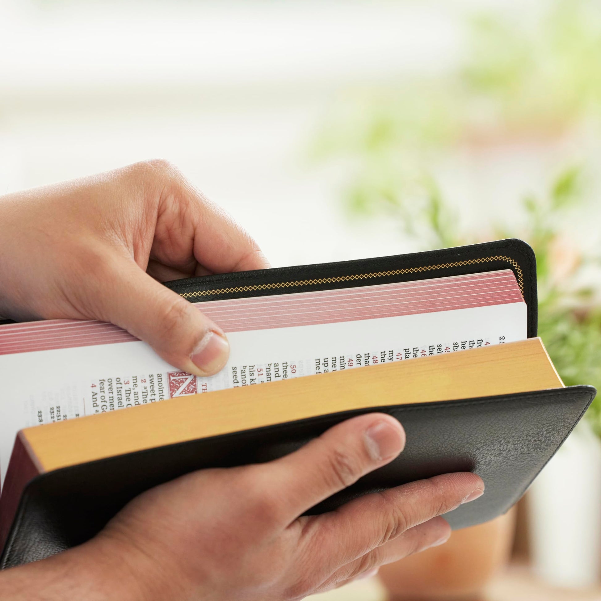 Features include: Presentation page to personalize this special gift by recording a memory or a note Bible book introductions provide a concise overview of the background and historical context of the book about to be read Line-matched classic 2-column format Extensive end-of-page cross references allow you to find related passages quickly and easily Reading plan guiding you through the entire Bible in a year Concordance for looking up a word’s occurrences throughout the Bible Full-color maps show a visual representation of Israel and other biblical locations for better context Three satin ribbon markers for you to easily navigate and keep track of where you were reading Art-gilded page edges 36 gsm European Bible paper Premium goatskin cover with classic raised spine details Durable Smyth-sewn binding lies flat in your hand or on your desk Easy-to-read 9.5-point KJV Comfort Print