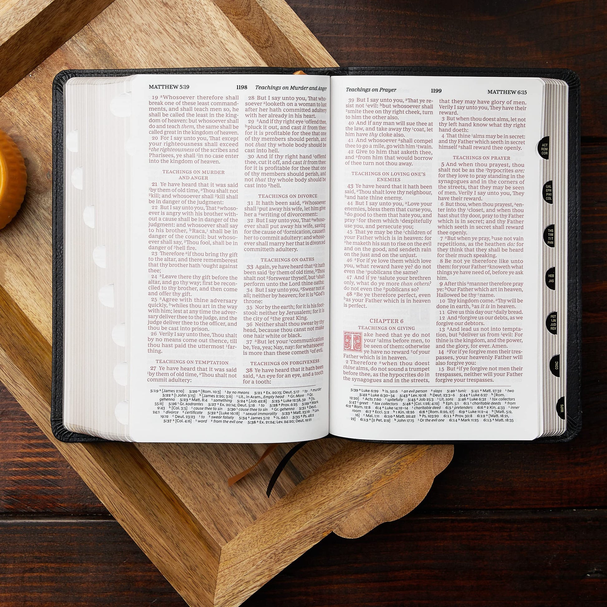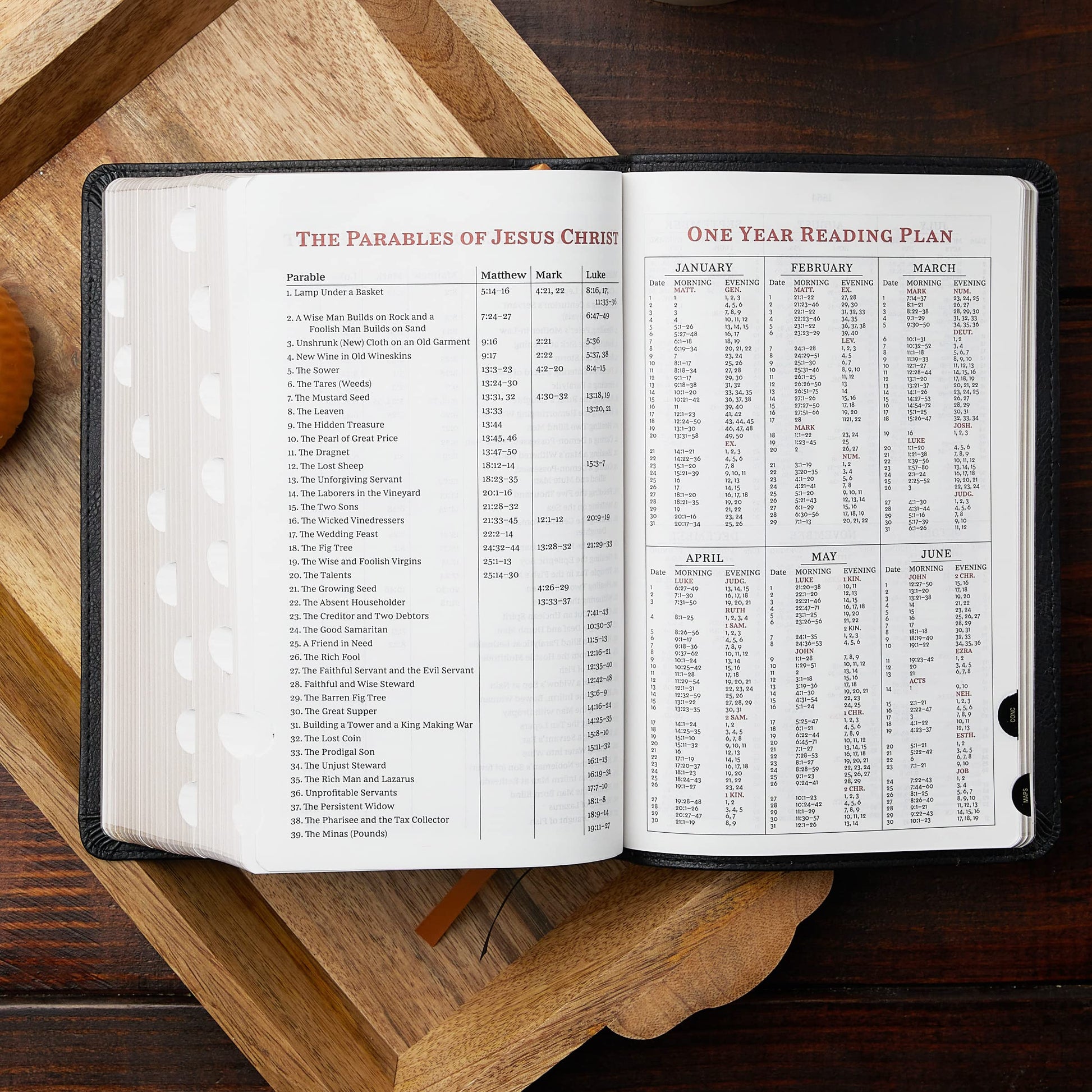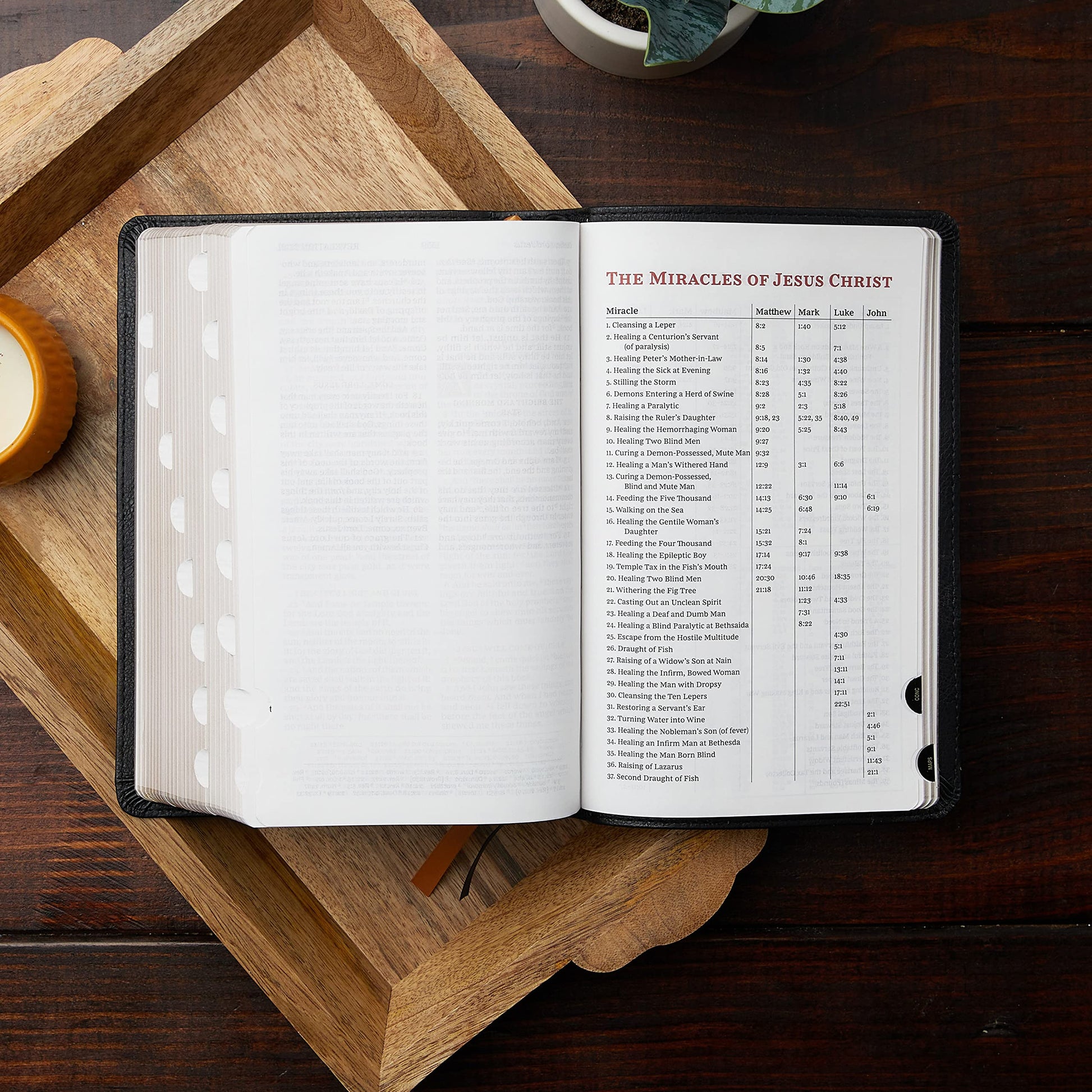 Features include: Thumb indexes showcase the abbreviated books of the Bible to quickly find portions of Scripture Line-matched classic 2-column format for a comfortable reading experience Extensive end-of-page cross references allow you to find related passages quickly and easily Translation notes provide a look into the thinking of the translators with alternative translations that could Presentation page to personalize this special gift by recording a memory or a note Bible book introductions provide a concise overview of the background and historical context of the book about to be read Words of Christ in red help you quickly identify Jesus’ teachings and statements Reading plan guiding you through the entire Bible in a year Concordance for looking up a word’s occurrences throughout the Bible Full-color maps show a visual representation of Israel and other biblical locations for better context Two satin ribbon markers for you to easily navigate and keep track of where you were reading Gilded page edges add a beautiful shine around the border of the paper Durable Smyth-sewn binding lies flat in your hand or on your desk Easy-to-read 9.5-point KJV Comfort Print