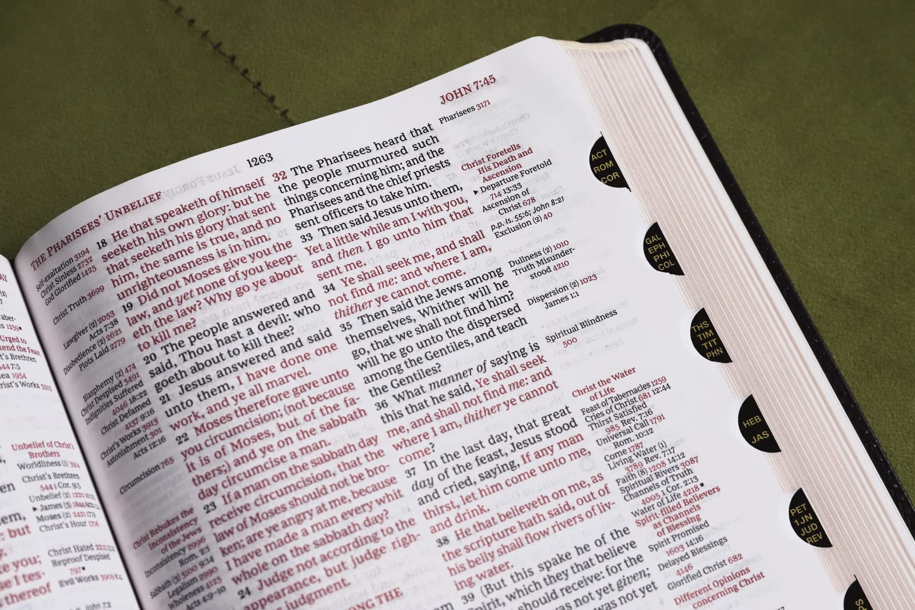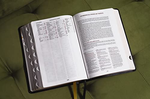 Features: Complete text of the King James Version (KJV) Easy-to-understand chain-reference system with over 100,000 references Alphabetical and numerical indexes highlight study materials for over 8,000 topics, each with its own topic number, for exhaustive topical study An extensive study resource section includes biographical sketches, illustrated studies of the Bible, a concordance, Bible harmonies, and many other helpful study tools Fresh, two-color page design 66 book introductions 16-page full-color map section with map index Line-matched text for enhanced readability Words of Jesus in red Presentation page for gift-giving Gilded page edges Two double-sided satin ribbon markers, each 3/8-inch wide European bonded leather cover lies flat when open Thumb indexed to make finding the books of the Bible easier Exclusive KJV Comfort Print typeface Print size: 9.5