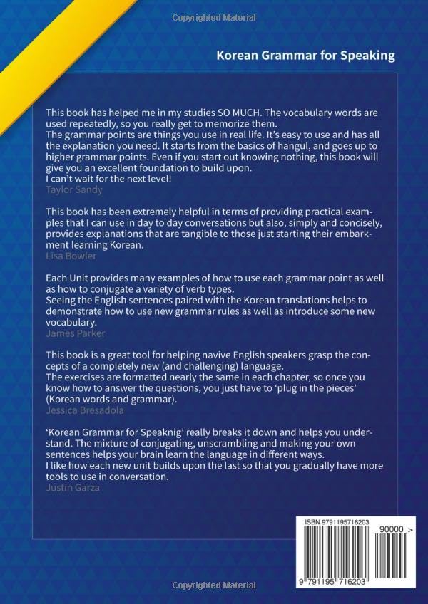 Details: Song Won’s Korean Grammar for Speaking is the quintessential text for learning how to speak and write Korean. As a proven, passionate, and dedicated teacher, Song Won has perfected his language learning system in the classroom. Now, he’s finally put those same methods into an informative, easy-to-understand textbook. Korean Grammar for Speaking is methodically organized and broken down into separate units. In the beginning, students will build a foundation by learning how to read, write, and pronounce Hangul (the Korean alphabet). From there, students will learn everything from the counting systems and present tense verbs, to more complex and complicated grammatical concepts. Within each unit, there will be vocabulary lists, a wide variety of practice problems, and end-of-unit quizzes. This comprehensive language learning textbook will have you speaking, reading, and writing Korean in no time! Along with Korean grammar, this textbook will teach students important vocabulary words that are useful in many common, everyday situations. It will also highlight Korean slang and colloquialisms, as well. Song Won’s language learning method is different from classic, traditional textbooks. This book will have students thinking and responding organically in Korean. The goal of Korean Grammar for Speaking is to make students fluent in Korean within six months. Although learning Korean will be a challenge, it’s a challenge that will reward students many times over.