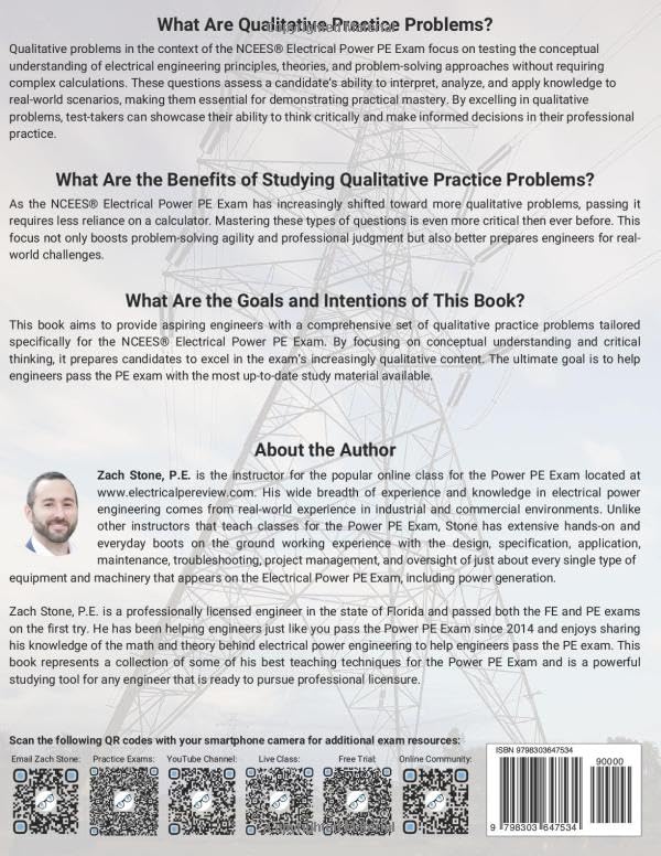 This book aims to provide aspiring engineers with a comprehensive set of qualitative practice problems tailored specifically for the NCEES Electrical Power PE Exam. By focusing on conceptual understanding and critical thinking, it prepares candidates to excel in the exam’s increasingly qualitative content. The ultimate goal is to help engineers pass the PE exam with the most up to date study material available.