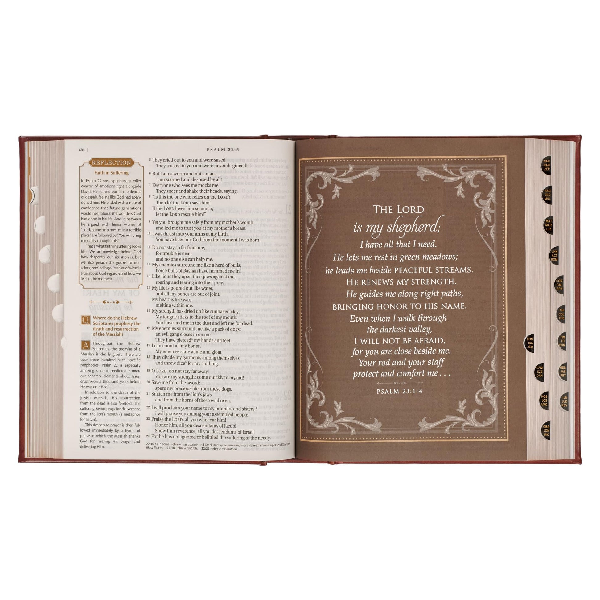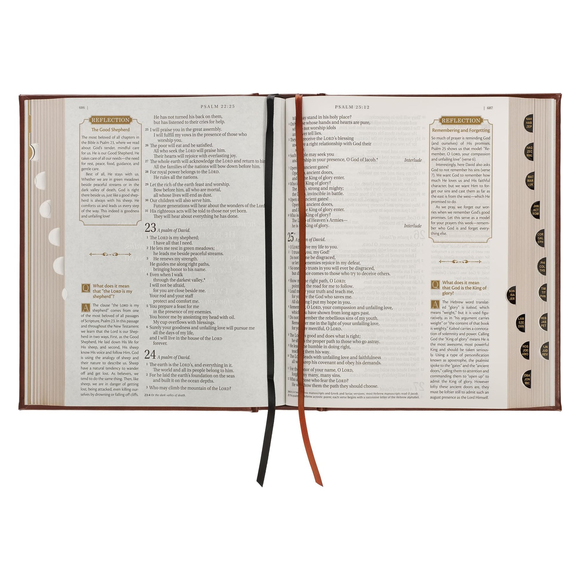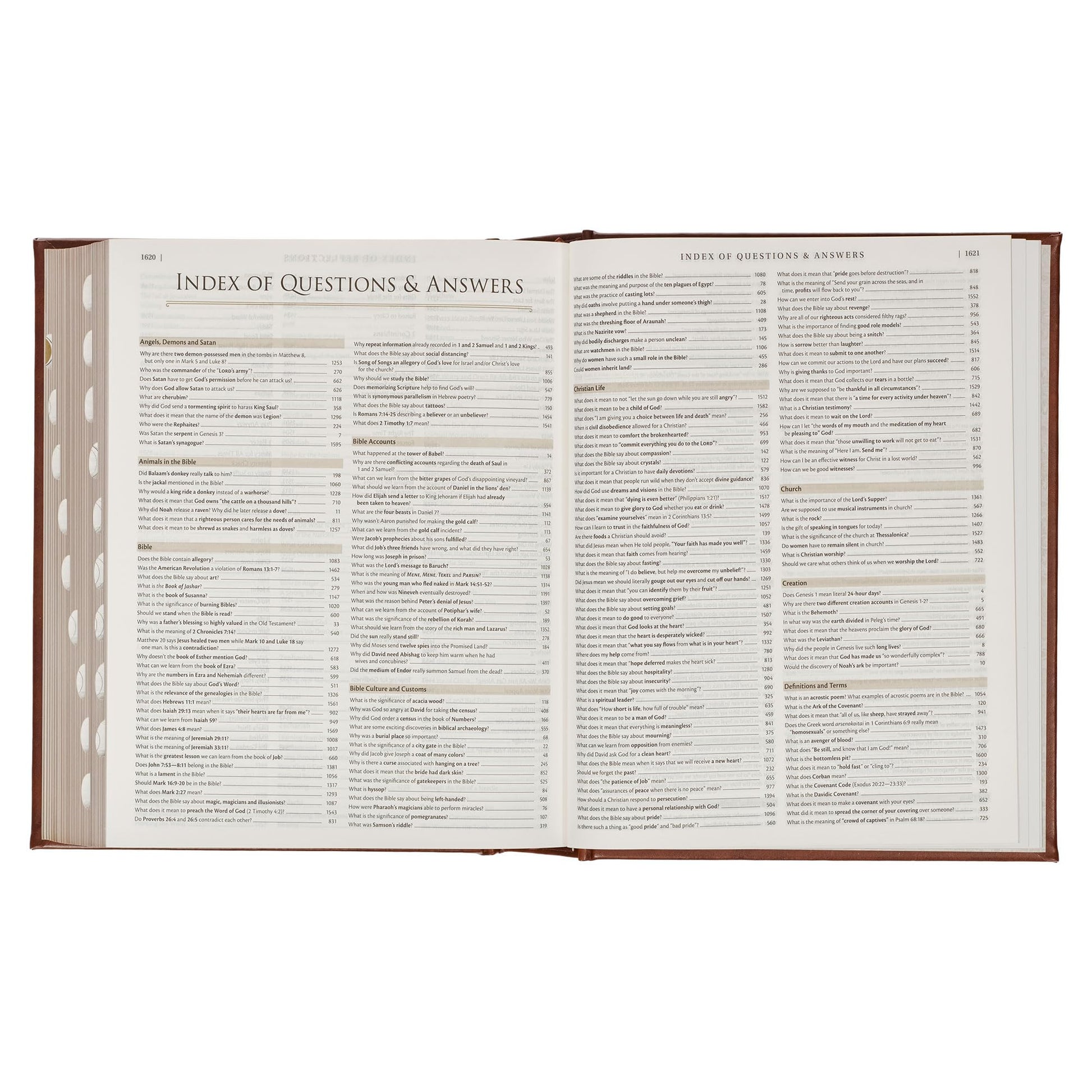 Dive into a deeper understanding of the Bible when you study over 900 practical and theological Q&As that clarify what is meant by topics like salvation, daily Christian life, aspects of God, and Bible characters. These are easily accessible through a topical index at the back of the Bible. There are also almost 700 insightful reflections by Nancy Taylor scattered throughout. These reflections offer fresh perspectives on passages, and they are perfect for personal or family devotionals. Each reflection is conveniently indexed at the back, making it easy to navigate and revisit.