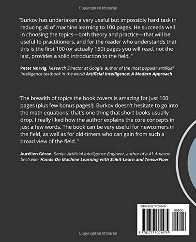 Peter Norvig, Research Director at Google, co-author of AIMA, the most popular AI textbook in the world: "Burkov has undertaken a very useful but impossibly hard task in reducing all of machine learning to 100 pages. He succeeds well in choosing the topics — both theory and practice — that will be useful to practitioners, and for the reader who understands that this is the first 100 (or actually 150) pages you will read, not the last, provides a solid introduction to the field."
