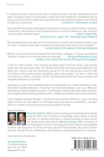 Learn ways you can: Hear what people mean, not just what they say. Share a difference of opinion without sounding dismissive. Encourage uncommunicative people to open up. Make sure both sides get heard in heated discussions. Get through to someone who never seems to listen. Ask for support without getting unwanted advice. Reduce miscommunication in texts and online. From renowned therapist Michael P. Nichols and new coauthor Martha B. Straus, the third edition reflects the huge impact of technology and social media on relationships, and gives advice for talking to loved ones across social and political divides