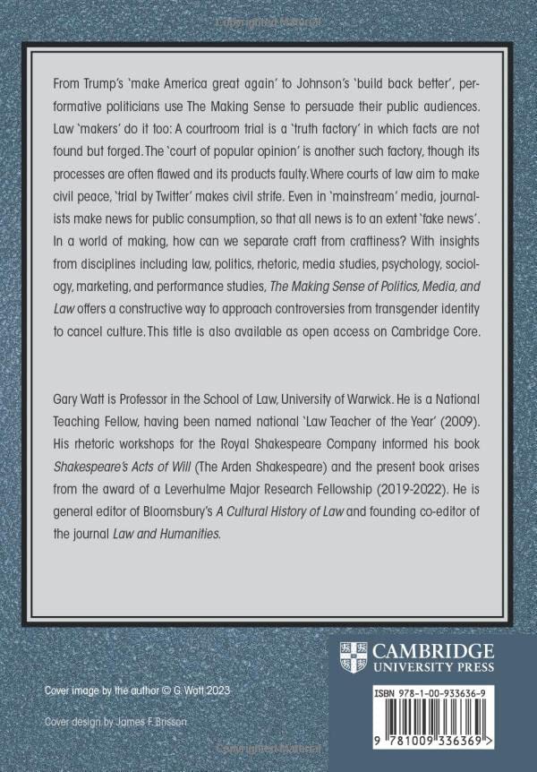 Details: From Trump's 'make America great again' to Johnson's 'build back better', performative politicians use The Making Sense to persuade their public audiences. Law 'makers' do it too: A courtroom trial is a 'truth factory' in which facts are not found but forged. The 'court of popular opinion' is another such factory, though its processes are often flawed and its products faulty. Where courts of law aim to make civil peace, 'trial by Twitter' makes civil strife. Even in 'mainstream' media, journalists make news for public consumption, so that all news is to an extent 'fake news'. In a world of making, how can we separate craft from craftiness? With insights from disciplines including law, politics, rhetoric, media studies, psychology, sociology, marketing, and performance studies, The Making Sense of Politics, Media, and Law offers a constructive way to approach controversies from transgender identity to cancel culture. This title is also available as open access on Cambridge Core.